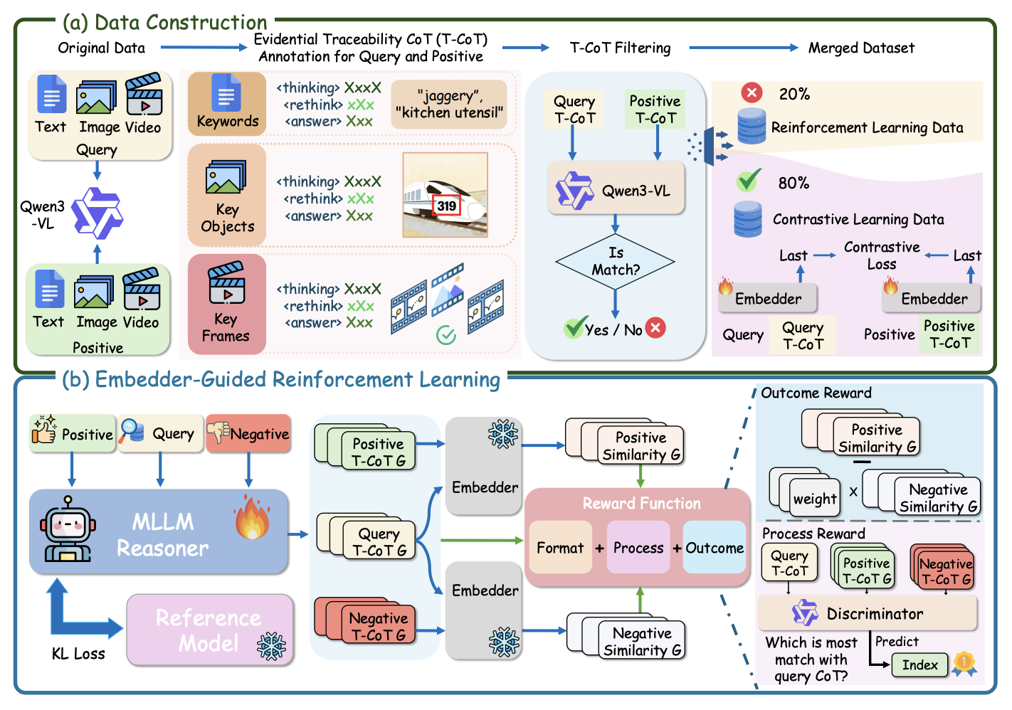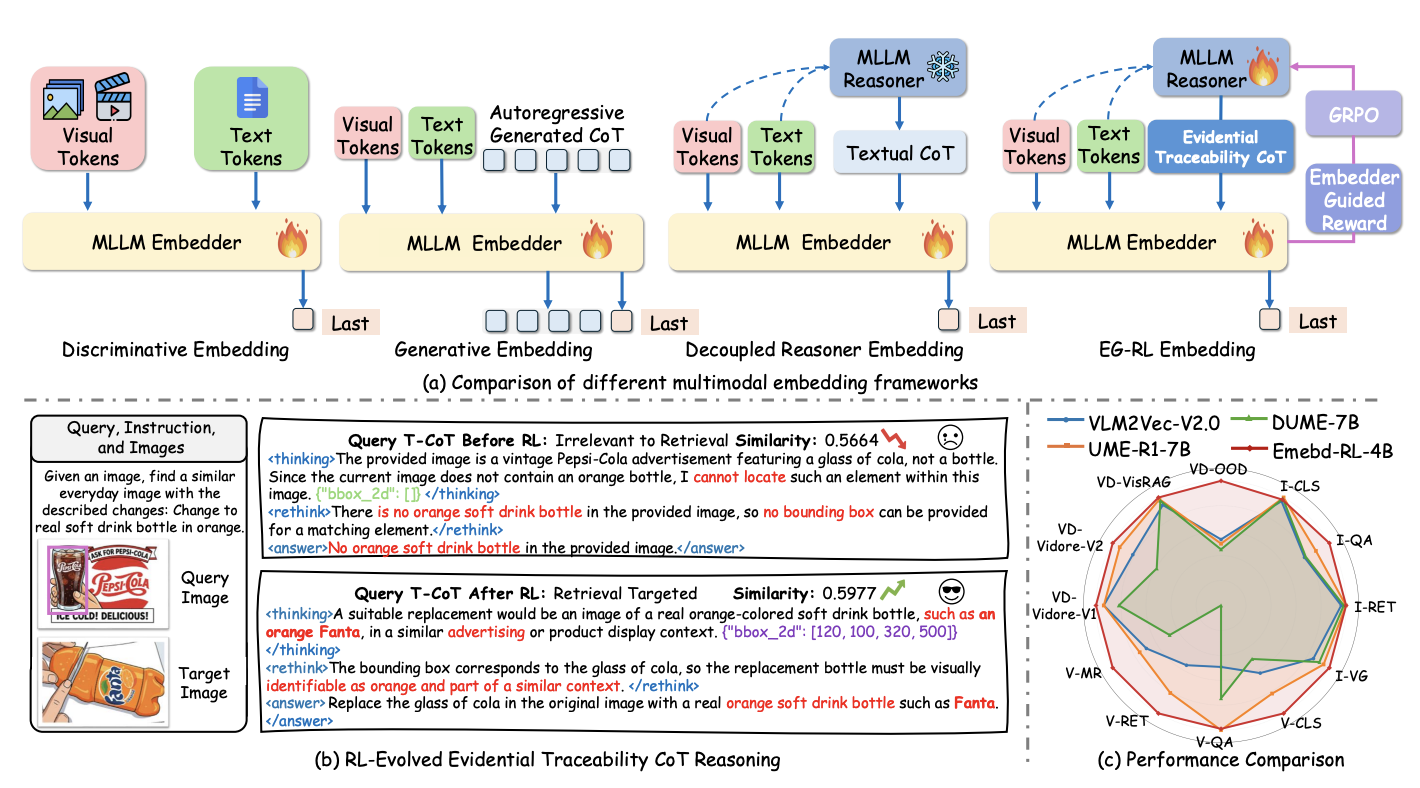 We propose a reasoning-driven Universal Multimodal Embedding framework that leverages Embedder-Guided Reinforcement Learning to generate retrieval-aligned, evidential Traceability CoTs, significantly improving cross-modal semantic consistency, fine-grained matching, and benchmark performance under limited computational resources.